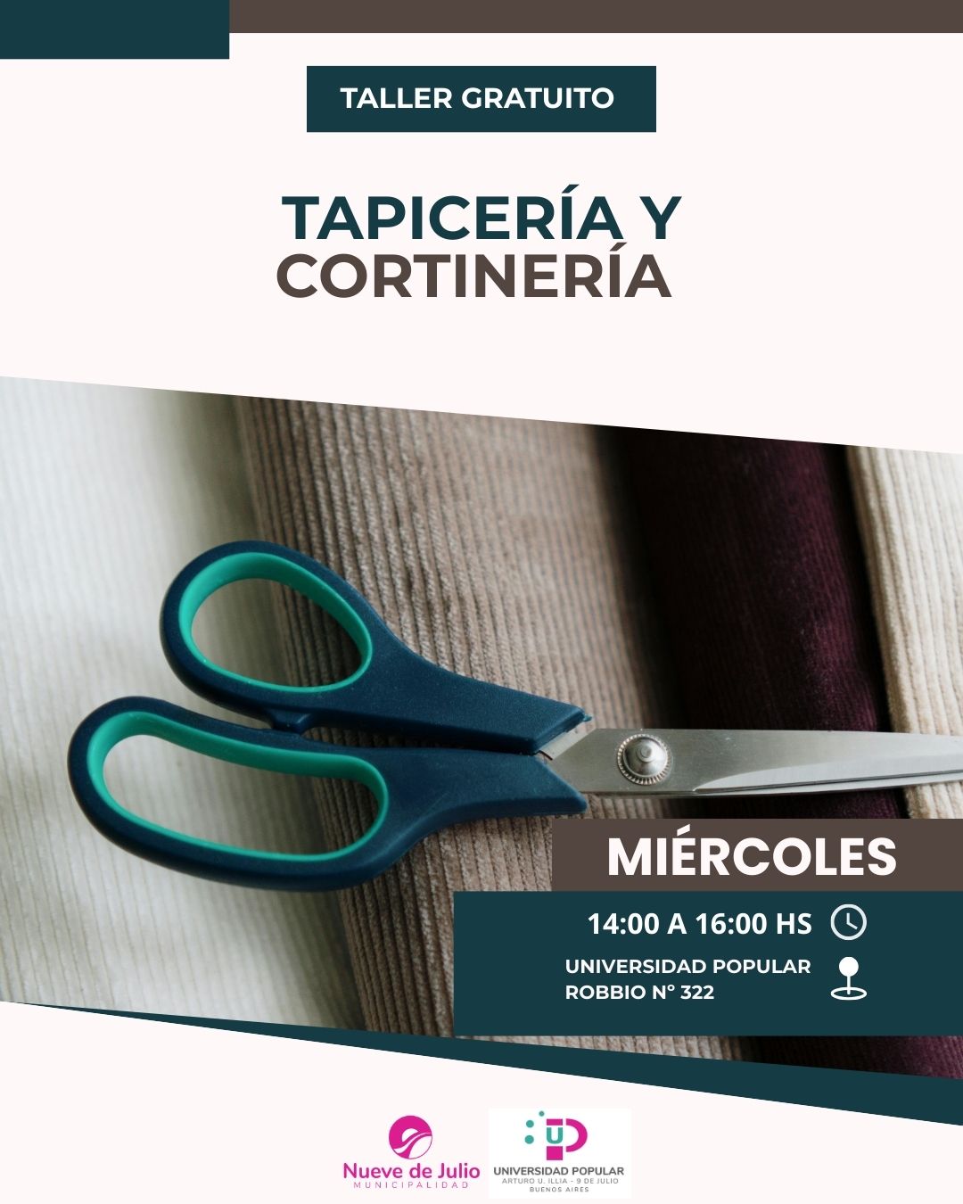Tapicería y Cortinería: Miércoles de 14:00 a 16:00 hs.