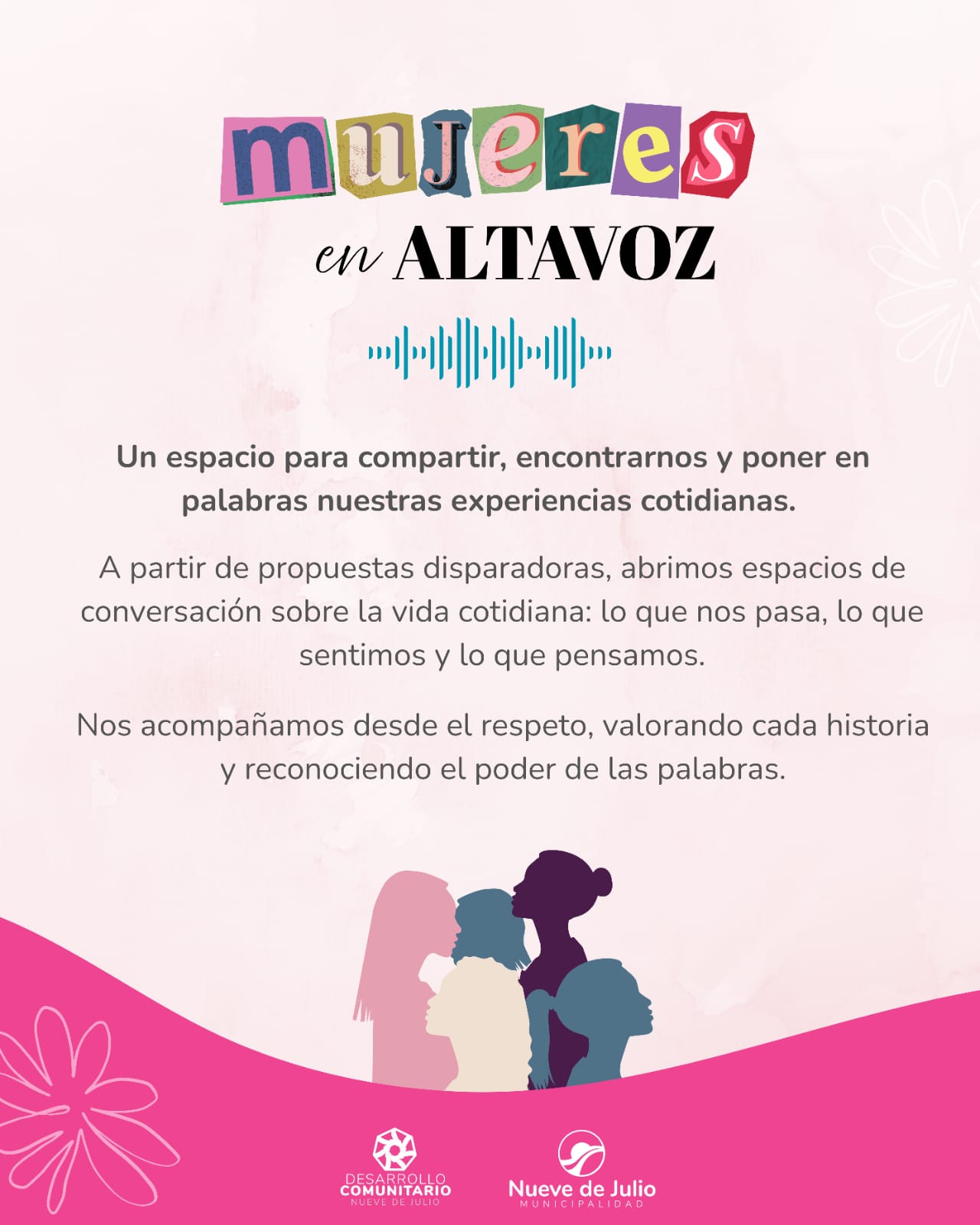 La Municipalidad de Nueve de Julio, a través de la dirección de Trabajo Social, informa la puesta en marcha de un nuevo espacio destinado a mujeres mayores de 18 años, con el objetivo de generar ámbitos de acompañamiento, escucha y participación.